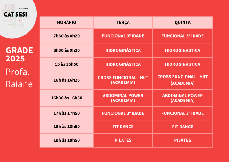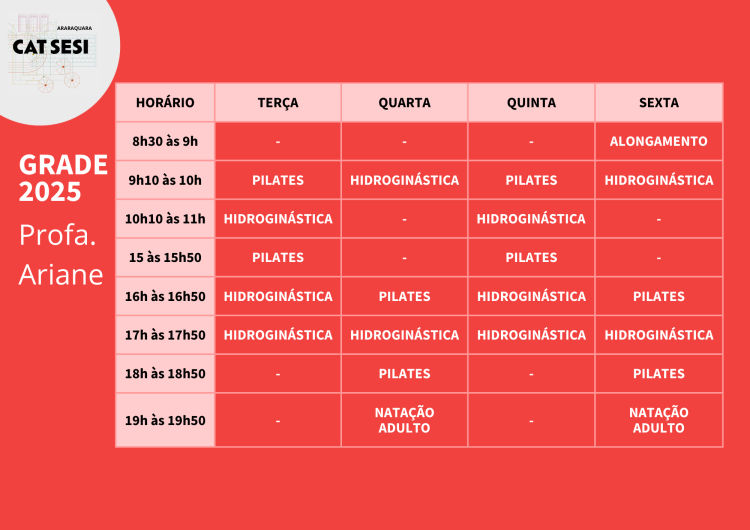 Terças e quintas: 8h30 | 15h (Raiane) / 10h10 | 16h | 17h (Ariane)