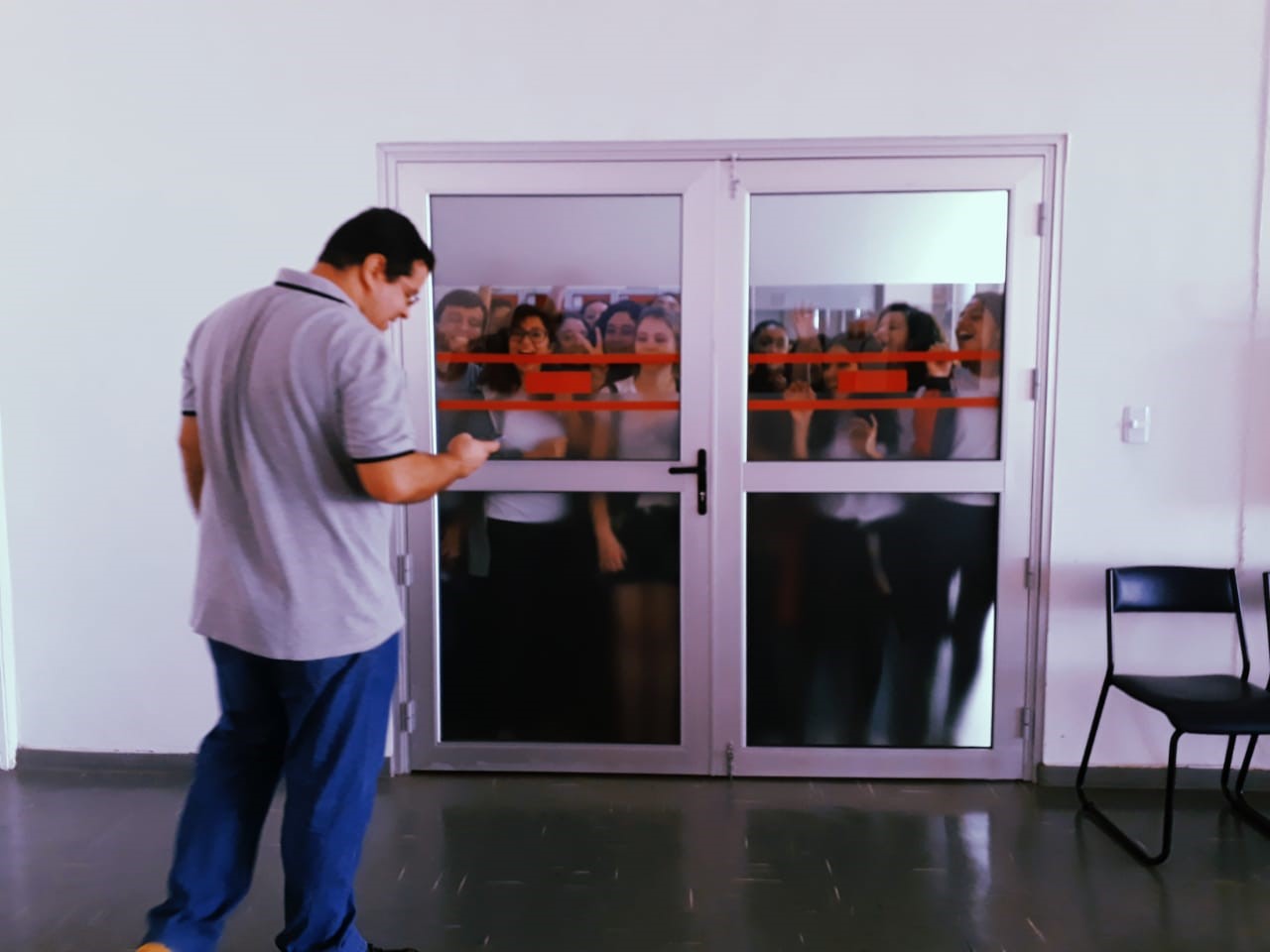 O bibliotecário Jadir de Oliveira Brito, segundos antes de abrir as portas da Feira do Livro do SESI 2019. (Foto de Bruna Vieira Ferreira)