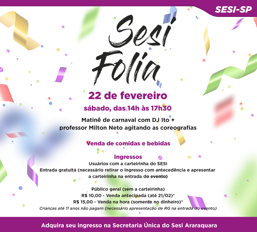 No sábado de Carnaval, 22 de fevereiro, das 14h às 17h30, adultos e crianças poderão se divertir no SESI Folia em Araraquara. A unidade convida toda a população para a matinê que promete muita música e animação.