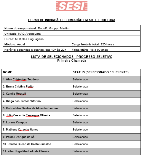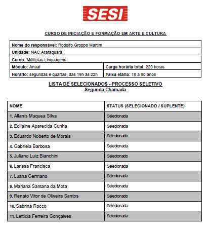 O Núcleo de Artes Cênicas do SESI Araraquara divulga a lista dos selecionados na primeira e segunda chamadas do curso anual Múltiplas Linguagens