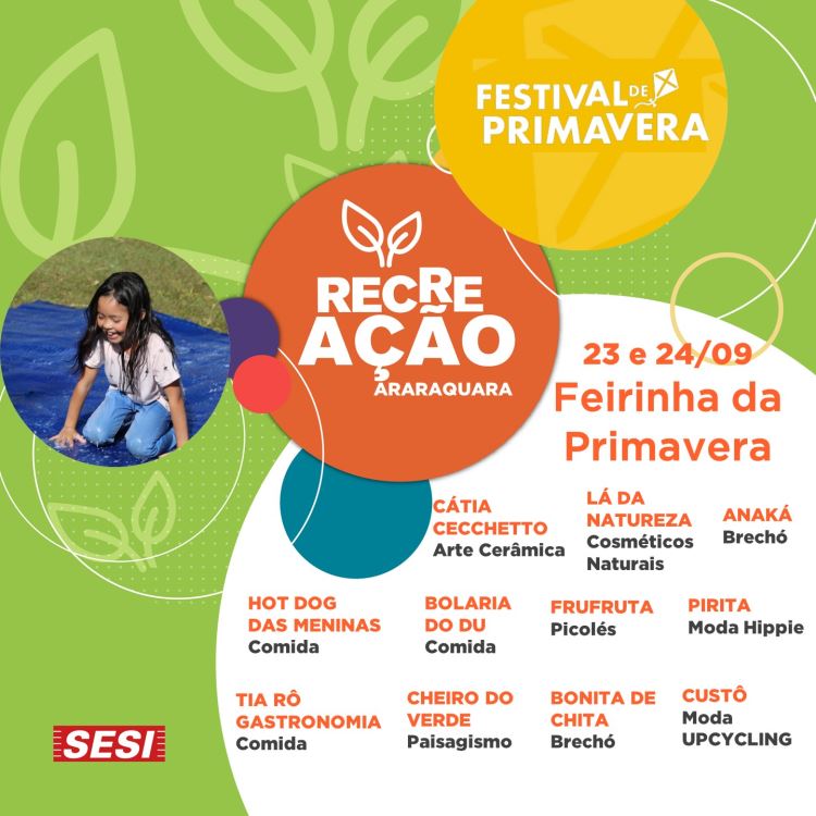 Com a chegada da nova estação (23/09), a equipe de lazer do CAT SESI Araraquara organiza uma programação com atividades diversas para começar a Primavera com o pé direito. Nos dias 23 e 24 de setembro, será realizado o “Festival de Primavera”, destinado a todas as idades.